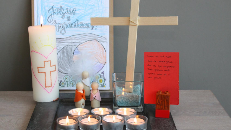 - Maak een gedenkplek (kijktafel) op een kast of tafel over Pasen. Gebruik de volgende voorwerpen: Een kaars, een kruis (kan je ook zelf maken), een (voorjaars) tak waar je iets in kunt hangen en minstens 1 (zelfgemaakte) hanger om in de tak op te hangen. Bijvoorbeeld een bloemetje van papier, een paaskuikentje of tekens van geloof (hartje, anker, duif) Maak hiervan een foto. (Zie afbeelding bij de werkvorm voor een voorbeeld.)