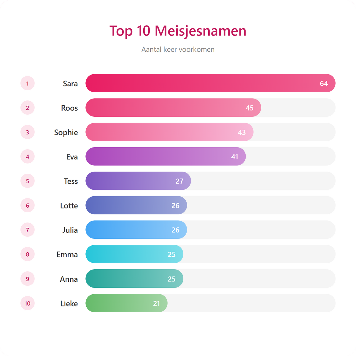 Toelichting: Bij samenvoeging van de meisjesnamen Sara(h)/Saar, Roos/Rosa/Rosie; Sophie/Sofie; Eva/Evi(e)/Evy; Tess/Tessa; Anna/Anne en bij jongensnamen Lucas/Luuk/Luca/Luuk/Lukas; Sam/Sem/Samuel; Boaz/Boas; Levi( e)/Lev en Daan/Daniel.