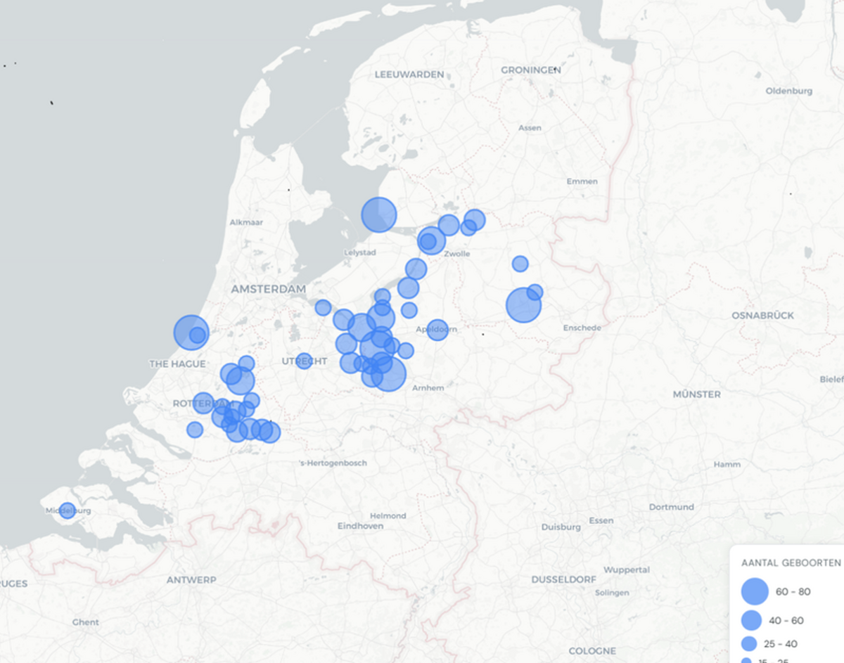 Figuur: Geografisch overzicht van geregistreerde geboorten van jongens en meisjes in 2025 naar aantallen.