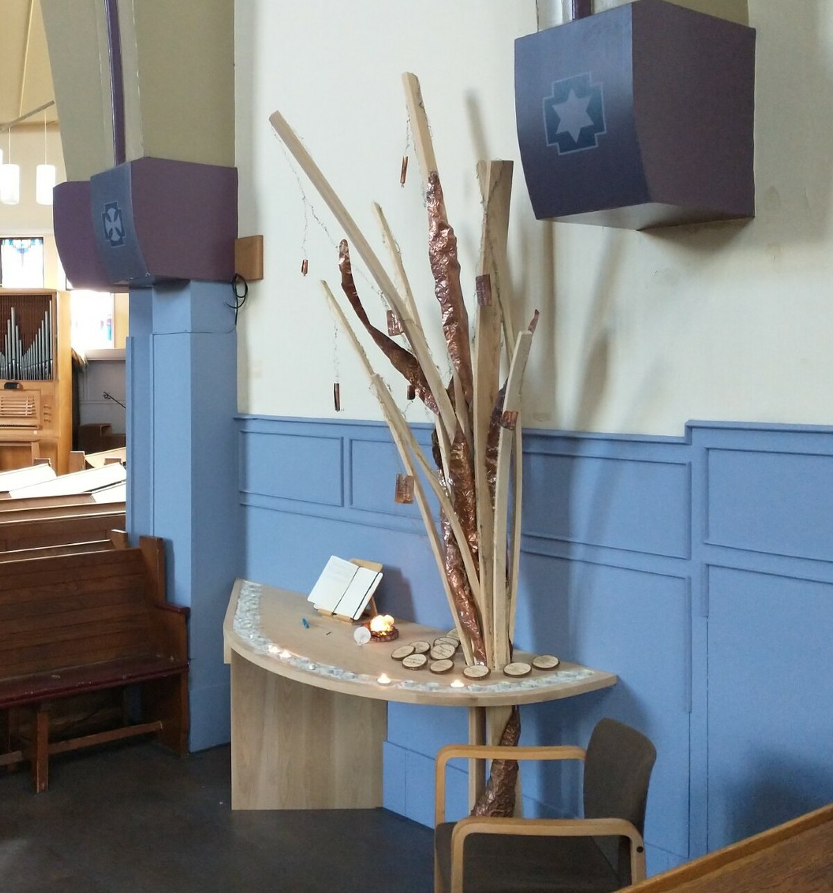 De NoorderLichtGemeente te Zeist heeft een Plek van Aandacht, met houten bogen die verwijzen naar de dragende bogen in de kerkzaal, die bescherming en geborgenheid geven, die geaard zijn op de grond en reiken naar de hemel. Het bewerkte koper voegt zich tussen en om de bogen: een opwaartse beweging van levenskracht en vuur. De kreukels, deuken en rimpels weerspiegelen het Licht en het leven. Langs de bogen kringelen draden, beekjes van kracht, die verbinden en kleur en groei brengen. Aan de draden hangen koperen rolletjes met daarin de namen geschreven van overledenen en gedoopten. De rolletjes van overledenen hangen wat open, die van de gedoopte kinderen zijn nog opgerold. De namen hangen zo in de ruimte tussen de bogen, waar beweging is en de wind, de Geest, doorheen waait.