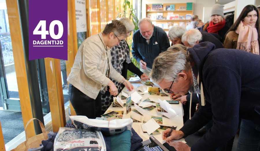 Tijdens het koffiedrinken na de dienst was er gelegenheid om met elkaar in gesprek te gaan. Veel gemeenteleden stonden in de rij om een persoonlijke groet op de paaskaarten te schrijven. De uitleg in de dienst had hen geraakt. “Nu weten we wat het betekent voor een gedetineerde om een kaart te ontvangen”, vertelt een gemeentelid. “Ik heb extra mijn best gedaan op de bemoedigende tekst op de kaart.”