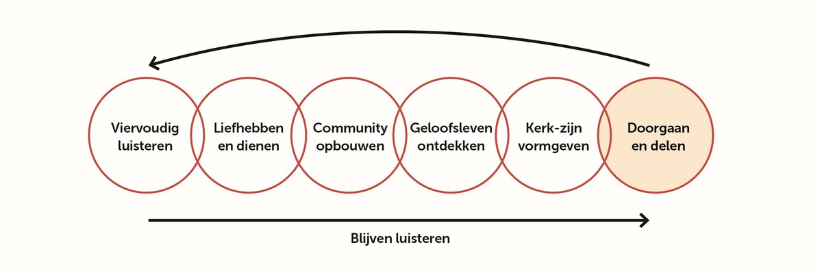 Doorgaan en delen is het laatste aandachtsgebied waar doorheen wordt gereisd. Het richt zich op het eigen voortbestaan. Maar ook op vermenigvuldiging, om daarmee te blijven bijdragen aan de groei van de kerk als brede beweging van hoop voor de wereld. Missionair in beweging blijven is een kernwaarde. Lees hier meer over de pioniersreis.