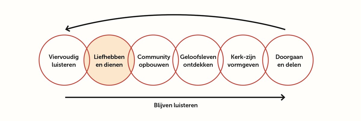 Vanuit het viervoudig luisteren ga je liefdevol betrokken op zoek naar mogelijkheden om elkaar in de omgeving te dienen. Samen probeer je iets van Gods nieuwe wereld zichtbaar en ervaarbaar te maken. Met klassiek kerkelijke woorden gaat het bij liefhebben en dienen om pastoraat en diaconaat. Pastoraal deel je het leven met anderen en samen zoek je het goede leven. Diaconaal kun je van alles doen rond de begrippen ‘barmhartigheid en gerechtigheid’. Dat wil zeggen dat je mensen nabij bent en helpt in hun gebrokenheid, dat je probeert om dingen recht te zetten en dat je bronnen van onrecht bestrijdt. Maar ook dat je jezelf nabij laat zijn en jezelf kwetsbaar opstelt in je eigen gebrokenheid. Zo probeer je samen met anderen de wereld in de omgeving een beetje mooier te maken.