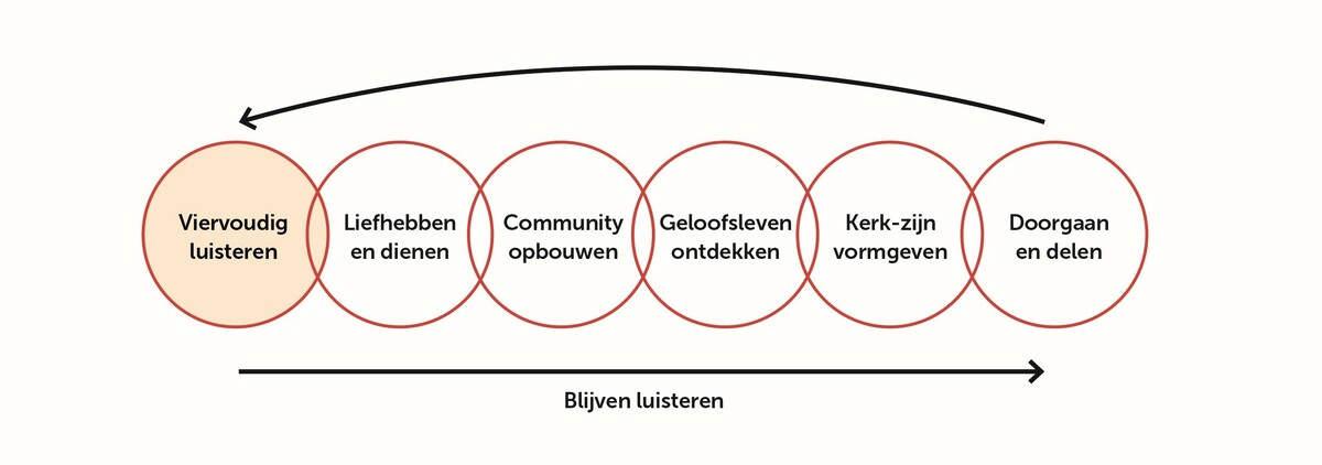 Viervoudig luisteren is een houding en hulpmiddel bij het pionieren met proefplekken. Het is het eerste aandachtsgebied waar je tijdens de pioniersreis doorheen reist. Daarna blijft alert reageren vanuit een open en ontvankelijke basishouding een kernwaarde. Hiermee zoek je voortdurend naar aansluiting bij Gods missie in de omgeving. Het belangrijkste doel van viervoudig luisteren is koers bepalen voor je proefplek en onderscheiden waar het op aan komt. Je luistert hierbij naar God vanuit vier invalshoeken: